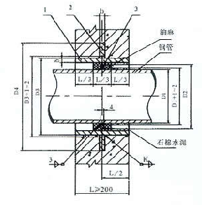 5、Ⅱ型套管穿墻處之墻壁,如遇非混凝土墻壁時應(yīng)改用混凝土墻壁,其澆注混凝土范圍,Ⅱ型套管應(yīng)比翼環(huán)直徑(D4)大200mm,而且必須將套管一次澆固于墻內(nèi)。套管內(nèi)的填料應(yīng)緊密搗實。