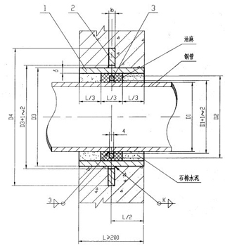 當(dāng)穿墻管的材質(zhì)和外徑等超出本圖集范圍,應(yīng)注意對(duì)防水套管的結(jié)構(gòu)形式、尺寸及縫隙內(nèi)采用的填料等進(jìn)行必要的調(diào)整和修正。