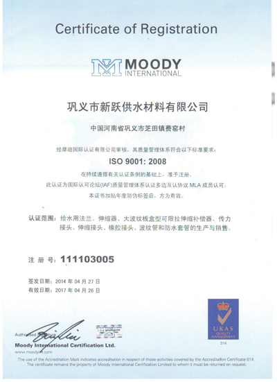 歡迎來到鞏義市新躍供水材料有限公司官方網站!您現在訪問的是:《ISO9001中文認證》頁面,如需幫助請致電:13140066578 或 0371-64100988